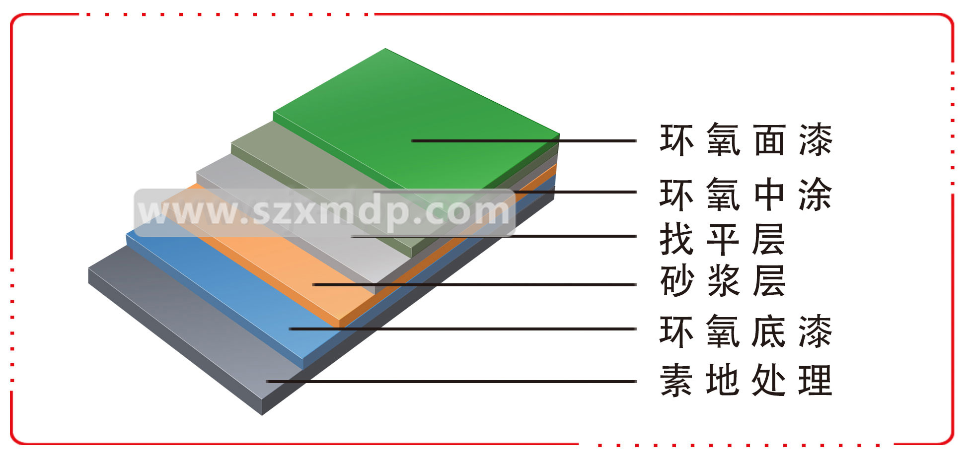 ![]() ◎ 選用無溶劑高級環(huán)氧樹脂加優(yōu)質(zhì)固化劑制成,無毒、無污染; ◎ 化學(xué)性能優(yōu)良,耐酸、堿、鹽、油類介質(zhì)腐蝕,特別耐強堿性能優(yōu); ◎ 平整光亮,可獲鏡面效果; ◎ 機械性能優(yōu)良,耐磨、耐壓、耐沖擊,有一定彈性; ◎ 施工快捷方便; ◎ 厚度2mm/8年,3mm/10年,4mm/12年,5mm/15年以上。 | ![]() 素地處理:打磨、吸塵處理: 底 涂:涂刷1-2遍環(huán)氧樹脂強滲透封閉底涂; 砂 漿 層:環(huán)氧樹脂中涂料調(diào)石英砂,用鏝刀或平刀抹刮,根據(jù)厚度要求可以多層施工; 找 平 層:再次打磨找平,進(jìn)行吸塵處理; 中 涂:批刮環(huán)氧樹脂中涂膩子層材料; 面 涂:用鏝刀將環(huán)氧樹脂自流平面漆鏝涂于中涂涂層之上 |